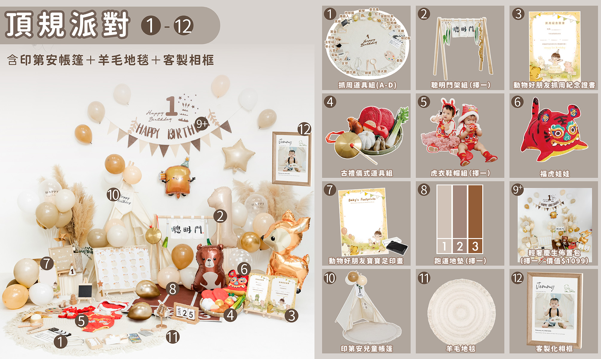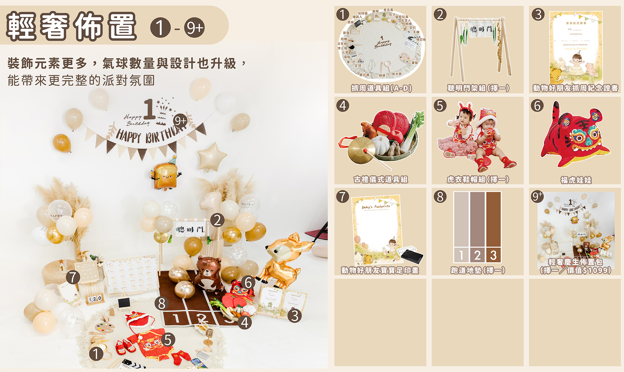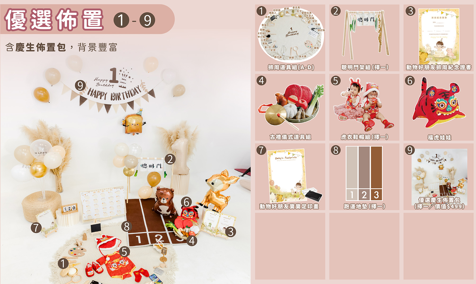果果為不同風格的家庭設計了五種租借方案, 每一套都能讓你在家輕鬆完成 寶寶抓周/週歲派對佈置, 從道具到儀式流程,全部一次搞定。