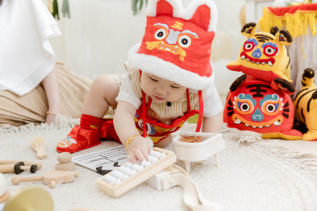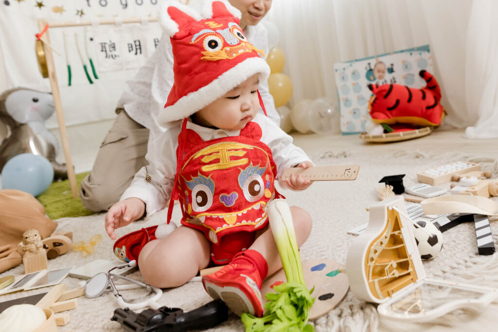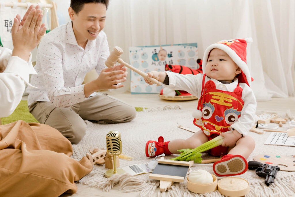 抓周的物品數量通常為6的倍數,取六六大順之意,一般常見是準備12、18、24項,將道具擺放於地毯上,讓寶寶任意抓取3項道具,寶寶抓到道具需保持超過3秒,才算成功挑選了1項道具唷!