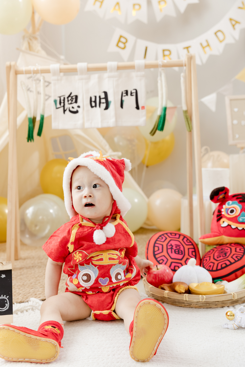 在這套抓周儀式道具組中,我們完整呈現全套原木道具陳列、聰明門、智慧鑼,以及象徵守護的虎衣虎鞋與福虎娃娃。