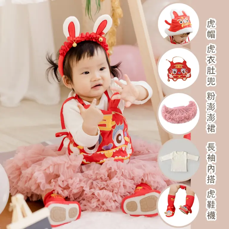 名稱:抓周必備 🔥 藕粉色虎衣裙裝套組(含內搭) x 虎帽 x 虎鞋襪套組產地:中國(台灣監製)